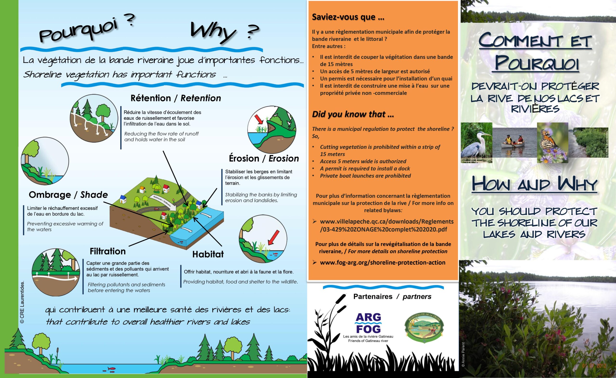 This shoreline protection awareness project was funded by the La Pêche Green Fund. It focuses on protecting the Gatineau River and watershed including lakes by raising awareness of the how the shorelines play a vital role in river health and water quality and the need to protect them. Our educational program focused on municipal employees, shoreline residents and the public at large. Materials produced include :